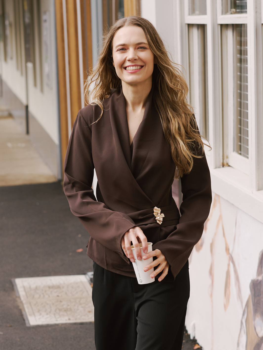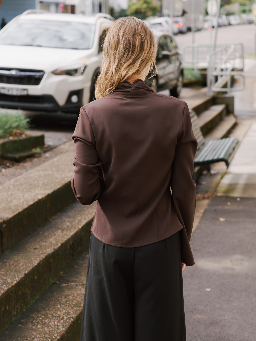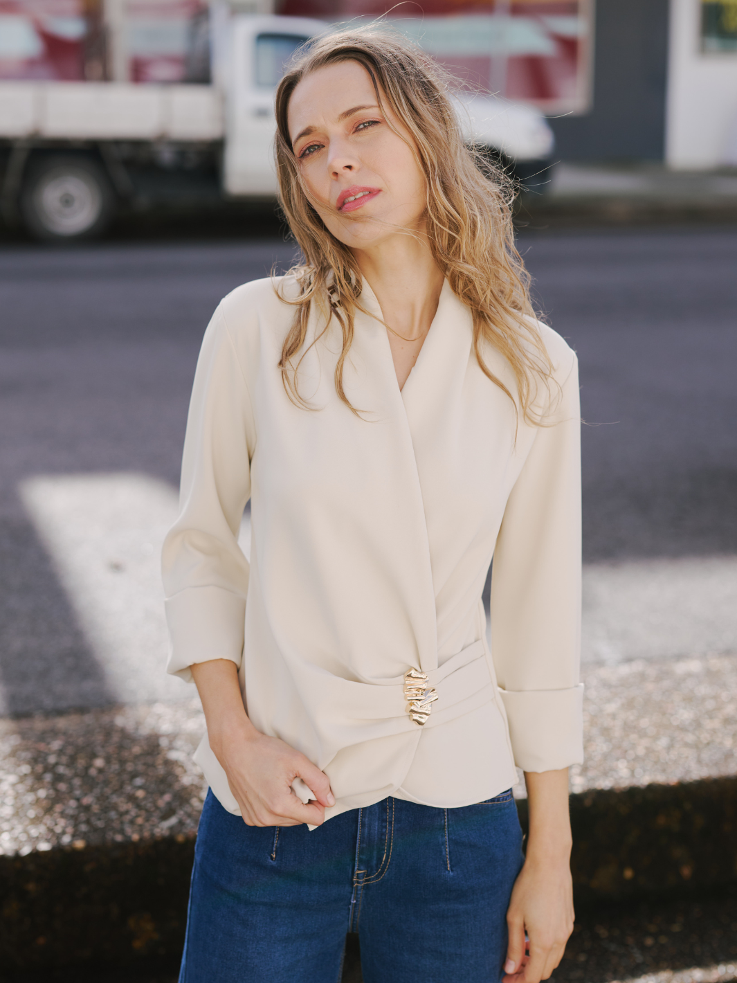 • Long sleeve, relaxed crossover top