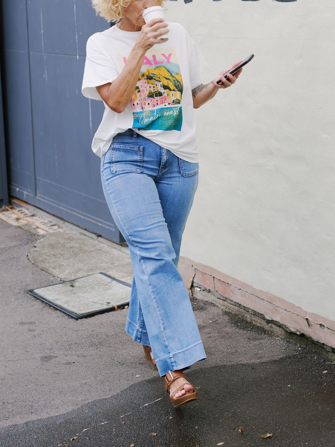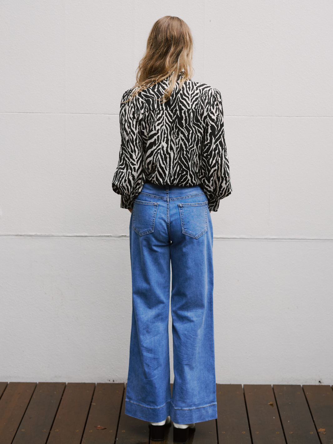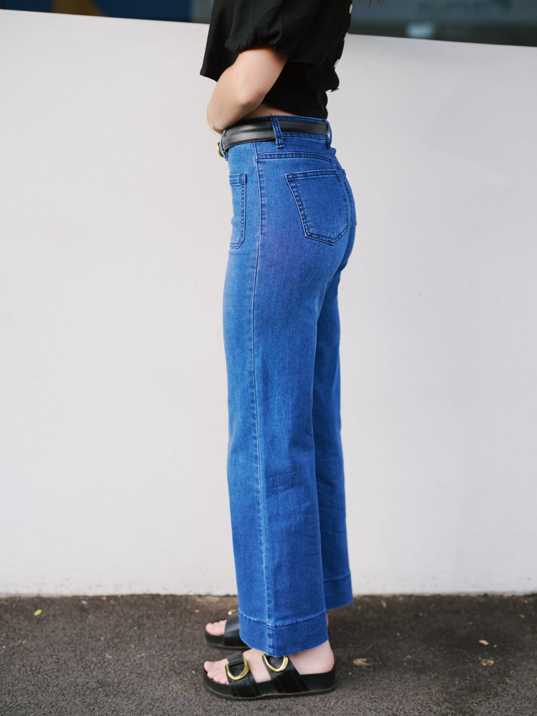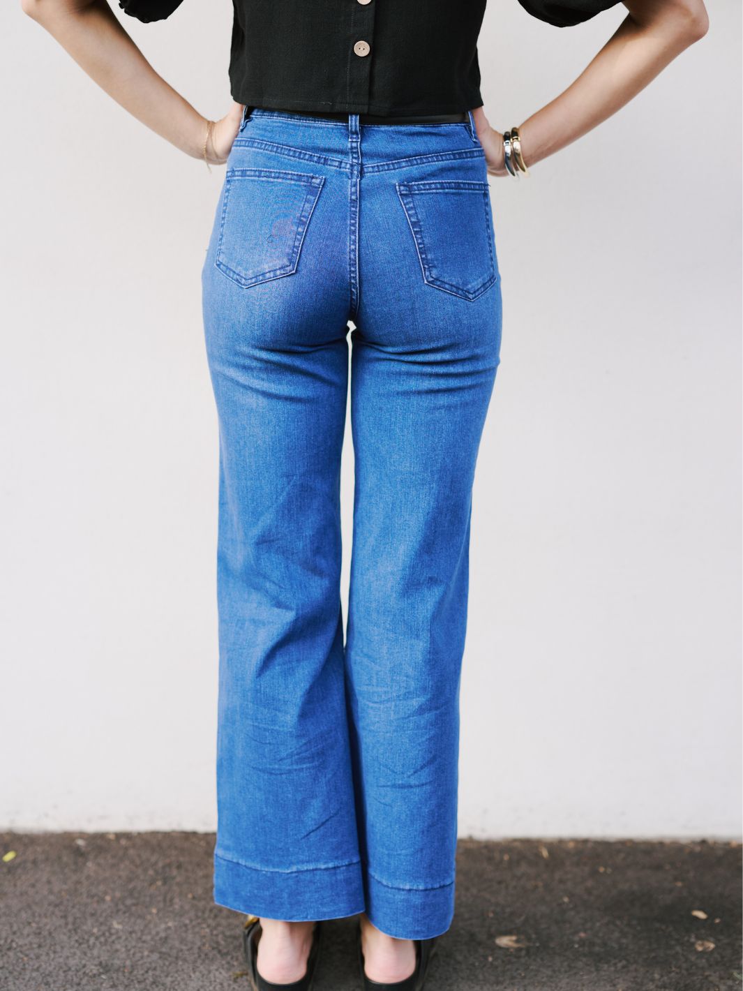 Introducing the WAYNE WIDE JEAN. Our flare cut and large cuff detail add a touch of retro to any outfit. With front patch pocket detailing, high waisted fit and stretch denim fabric, these jeans are both stylish and functional.